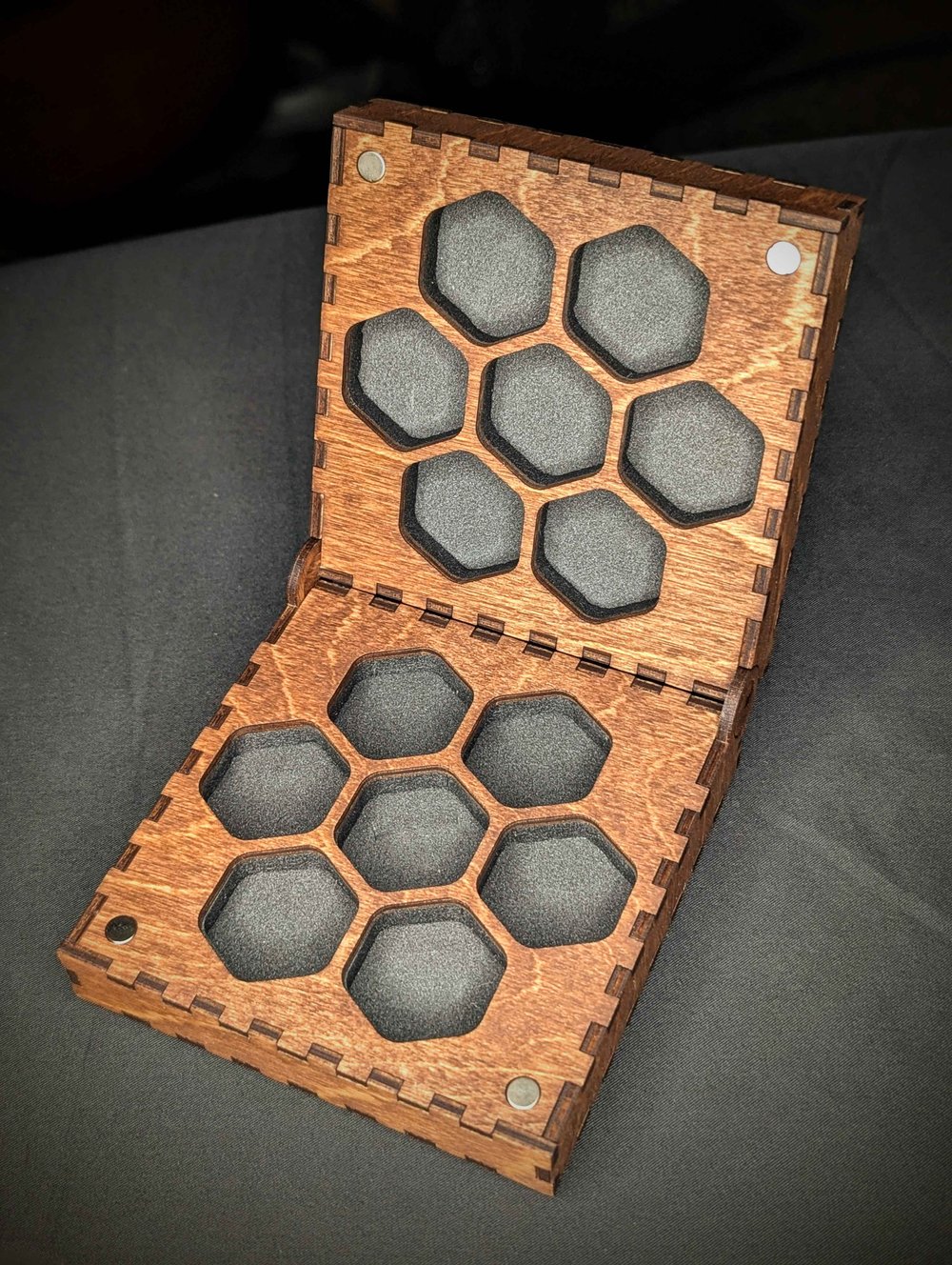 These handmade wooden dice boxes are laser cut and engraved and hand finished, assembled, and stained. Magnet closure gives it a nice snap. Holds a standard sized set of 7 dice. Engraved with the Bog Wizard logo on the front