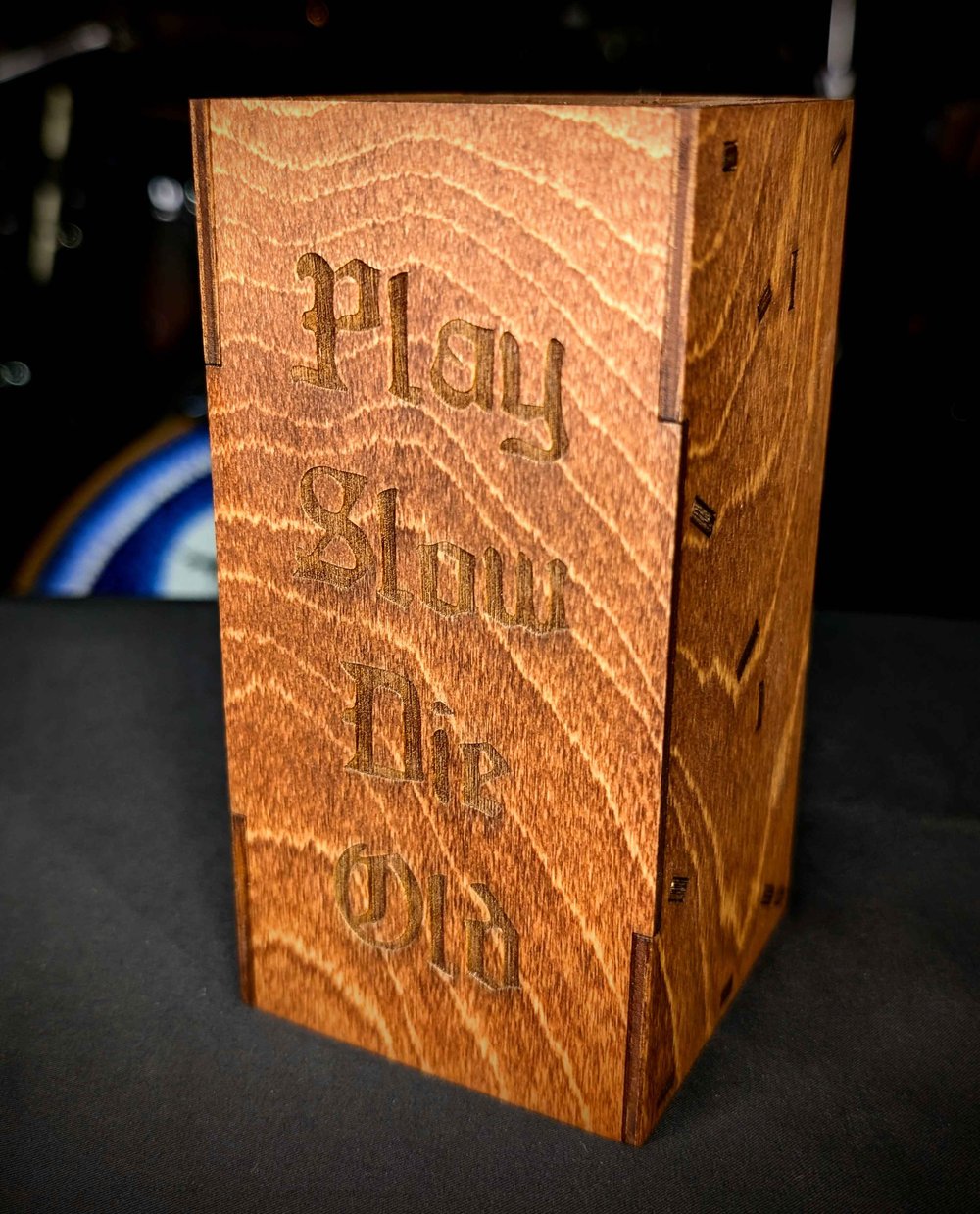 Handmade wooden folding dice tower, laser cut and engraved and hand finished, assembled, and stained by Altfitters, a side project of our very own drummer and guitarist. This tower folds up for transport, and has room to store 7 standard dice on the bottom panel. Being a wooden product, it will wear in over time and will likely arrive very tight. It is made our of Baltic Birch plywood and should hold up well over time, but if abused, it can break. As such, all sales are final unless there is a significant manufacture error, then reach out and we can figure it out for you. Does not work with oversized dice!